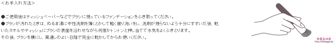 - 容易清洗。每天使用完,只要在紙上輕輕地把殘留在粉底掃/刷上的粉印掉。大約1個星期~2個星期才大洗一次,當然你平日的護理工作做得不好,大洗的頻率要高。一般我會使用粉底掃/刷專用的洗掃水,當然網上網誌有介紹其他方法,因KUMA沒有試用經驗,不作介紹。(值得一提(下圖):Shiseido講解如何清洗,把粉底掃/刷放進已用溫水稀釋的中性洗滌劑中,輕微攪絆/震盪。再用溫水清洗,以免留下任何洗滌劑。)清洗乾淨後,將粉底掃/刷放在通風良好的陰涼處靜置1~2天至已經乾透再使用。