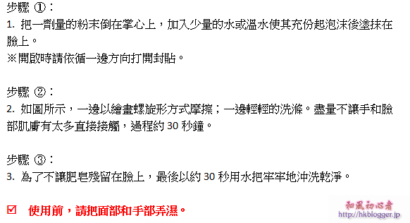 如果一次用一顆,倒出來是粉末狀;如果非一次用一顆,有時候難免會沒有壓緊,形成了小小的塊狀,怎麼也倒不出來,這時候便是小指/尾頭表現的機會──挖出來,嘿嘿!反正,也需要加水起泡泡後再使用,洗臉功效應該沒什麼分別吧!(2,000円用32天還貴貴的)