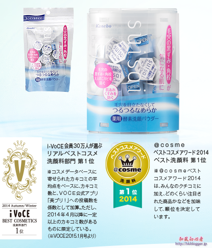 Kanebo Suisai 酵素洗顏粉(下稱:酵素洗顏粉)以「フレッシュクリア処方 毛穴の黒ずみ‧余分な角質を除去。毛穴の汚れを取り除き、つるつる肌へ。」廣告口號。意思為「新的清潔治療方法/處方, 處理黑色的毛孔(簡稱:黑頭/粉刺),除去多餘的角質層。帶走毛孔中的灰塵,變回光滑/滑溜的肌膚。」廣告隨時隨地都能吸引你的注意,到底酵素洗顏粉有何好處,是否與廣告中提及的效果一樣?!只要在搜尋器上輸入便出現不少的好評!