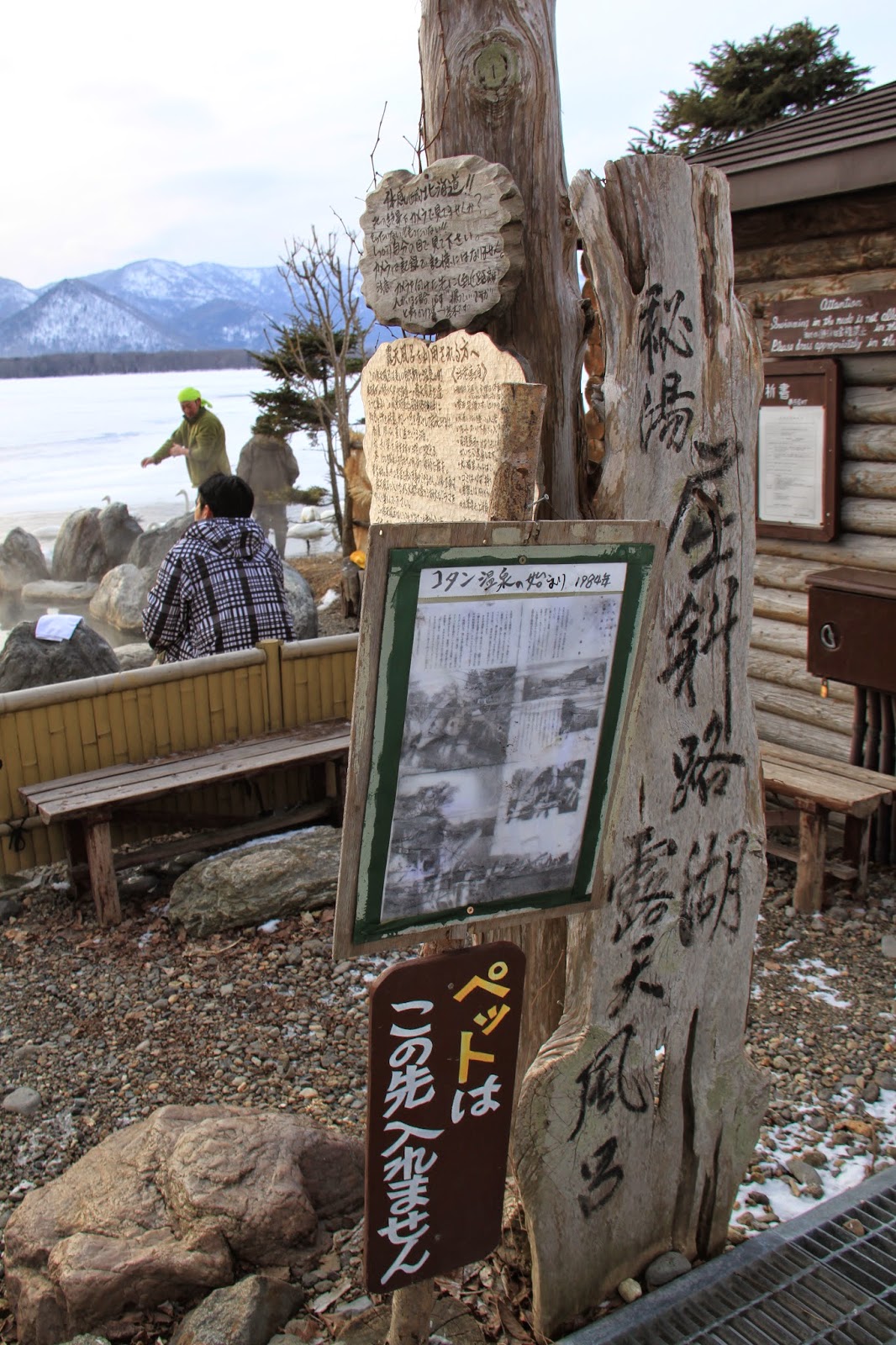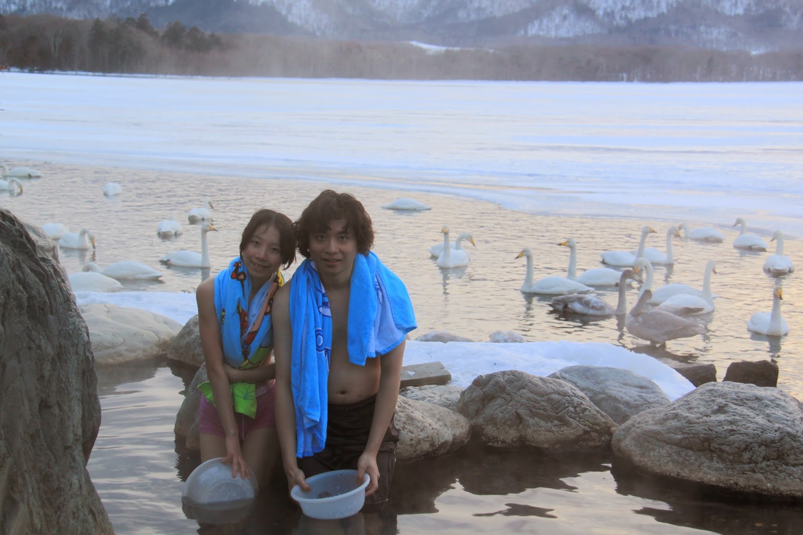 步行近大半小時後,我們終於到達傳說中的秘境湯。這個秘湯看似是由一個志願的叔叔管理,他替我和另外幾個遊人調整水溫。秘泉的左右兩邊各有一間木建的更衣室。浸在溫泉、仰望雪山湖景(此湖看似不結冰),天鵝就在我們旁邊嬉水玩樂,簡直人間仙境。這裡是半混浴模式,依靠中間大石分隔男女,但大家也可互相看到,遊客需穿上泳衣。