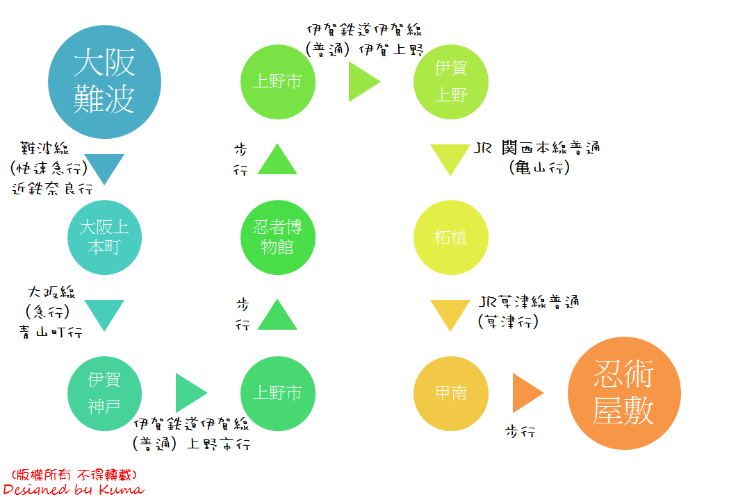 首先來到第一站:忍者博物館。從 大阪難波 乘坐 難波線(快速急行) 近鉄奈良行 到達 伊賀神戸(注意日本的鉄路行到某個站,明明出發時5卡列車變成1卡列車繼續前進,而餘下的車卡將回到出發點/其他目的地。是日之旅的朋友,當列車經過 大阪上本町 站時,緊記要多加留意,你有機會看見整車的人都離開車廂,而自己在好奇什麼!才發現,列車不知往什麼方向前進中。溫韾提示:盡量乘坐第一卡吧!)再轉乘 伊賀鉄道伊賀線(普通)上野行(此路線並不在Kansai Thru Pass的使用範圍)到達上野市。