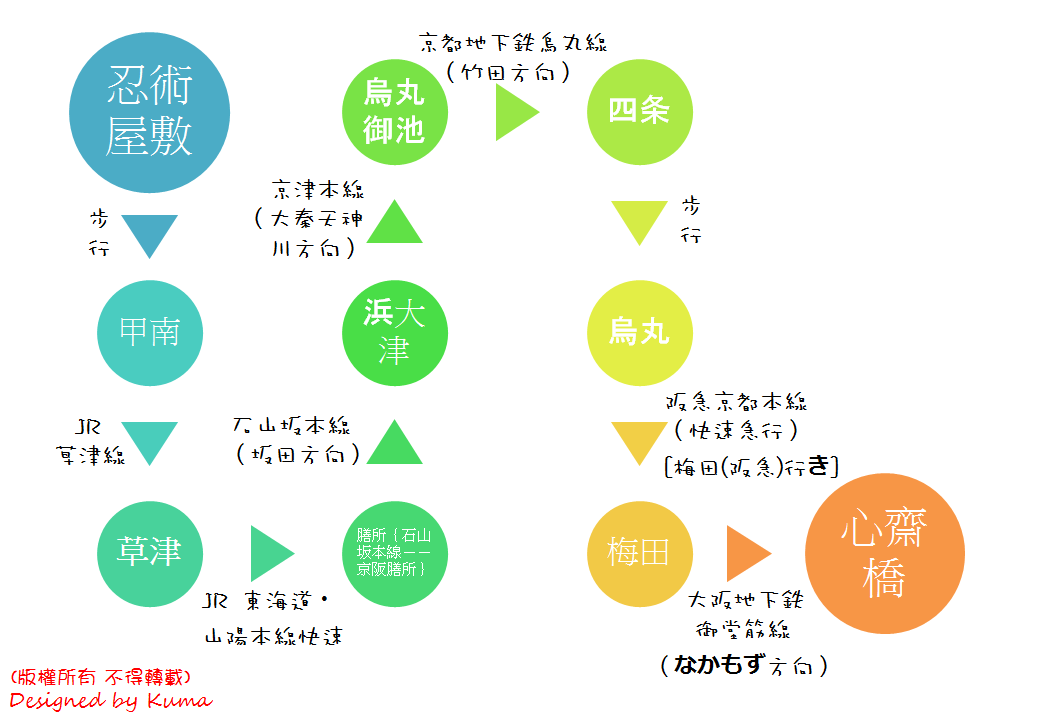 乘 JR 從 甲南(草津線) 到達 草津 轉成(東海道・山陽本線快速)到達 膳所{石山坂本線--京阪膳所}(假如你是 JR PASS 使用者,不防一程 JR 回到自已想去的地方),又可以回到 KANSAI THRU PASS 的天下 (注意:石山坂本線使用 KANSAI THRU PASS 必需於入閘位出示此 PASS 給車站職員看一下),到達 浜大津站 轉乘往 大秦天神川 方向,當到達 烏丸御池站 轉乘 京都地下鉄烏丸線到達 四条,步行到達 阪急京阪本線 烏丸站 回到 梅田站 轉回 大阪地下鉄御堂筋線(なかもず方向)回到心齋橋。(美女,太複雜了吧!我不太明白。)